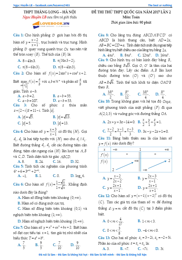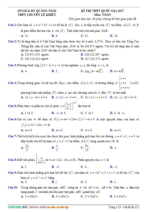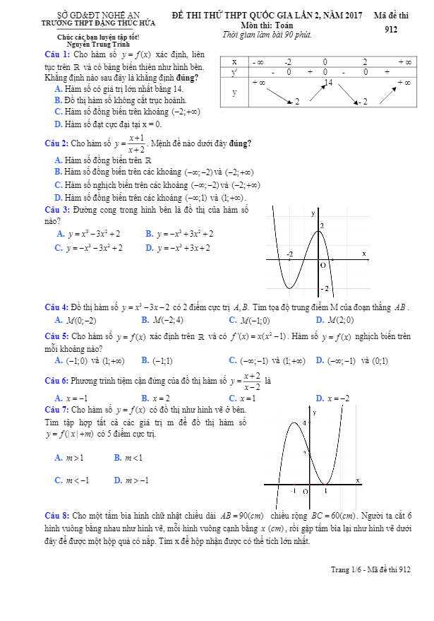 Đề Thi Thử THPT Môn Toán 2017