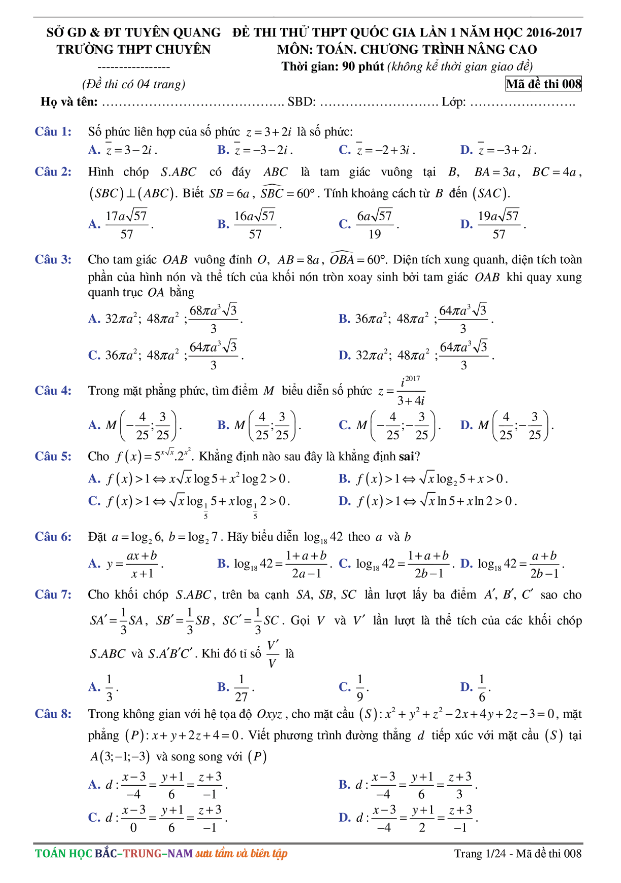 Đề thi thử THPT Quốc gia 2017 môn Toán trường THPT chuyên Tuyên Quang lần 1