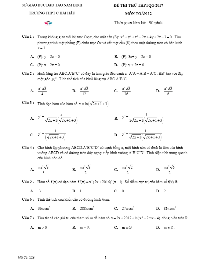 Đề thi thử THPT Quốc gia 2017 môn Toán trường THPT Hải Hậu C – Nam Định
