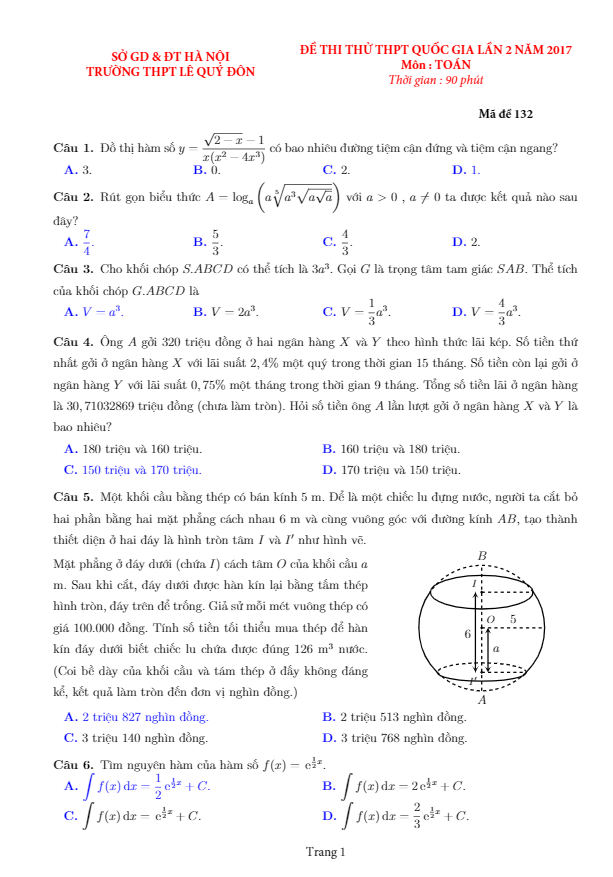 Đề thi thử THPT Quốc gia 2017 môn Toán trường THPT Lê Quý Đôn – Hà Nội lần 2