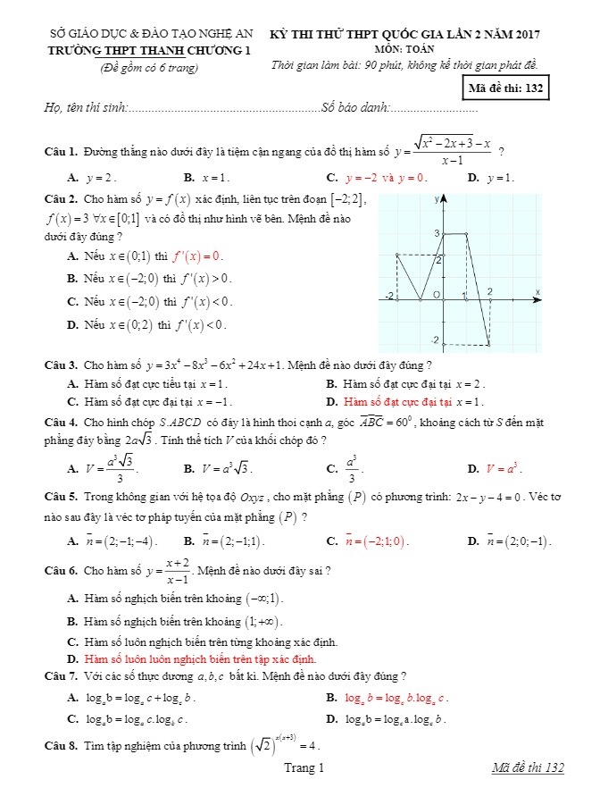 Đề thi thử THPT Quốc gia 2017 môn Toán trường THPT Thanh Chương 1 – Nghệ An lần 2