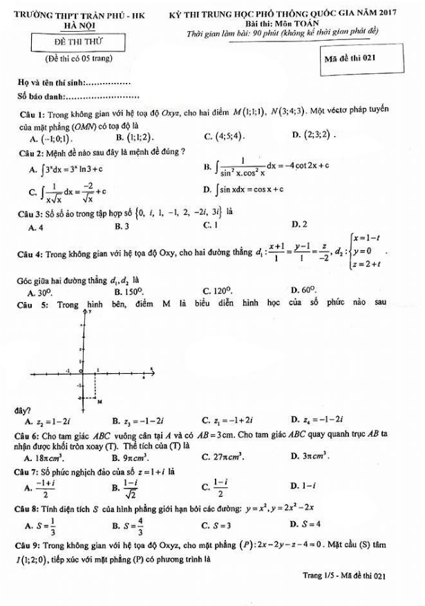 Đề thi thử THPT Quốc gia 2017 môn Toán trường THPT Trần Phú – Hà Nội