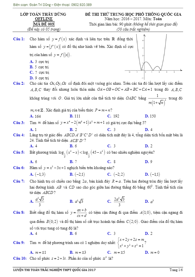 Đề thi thử THPT Quốc gia 2017 môn Toán – Đoàn Trí Dũng lần 6