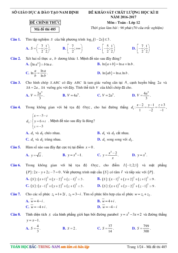 Đề thi thử THPT Quốc gia 2017 môn Toán sở GD và ĐT Nam Định