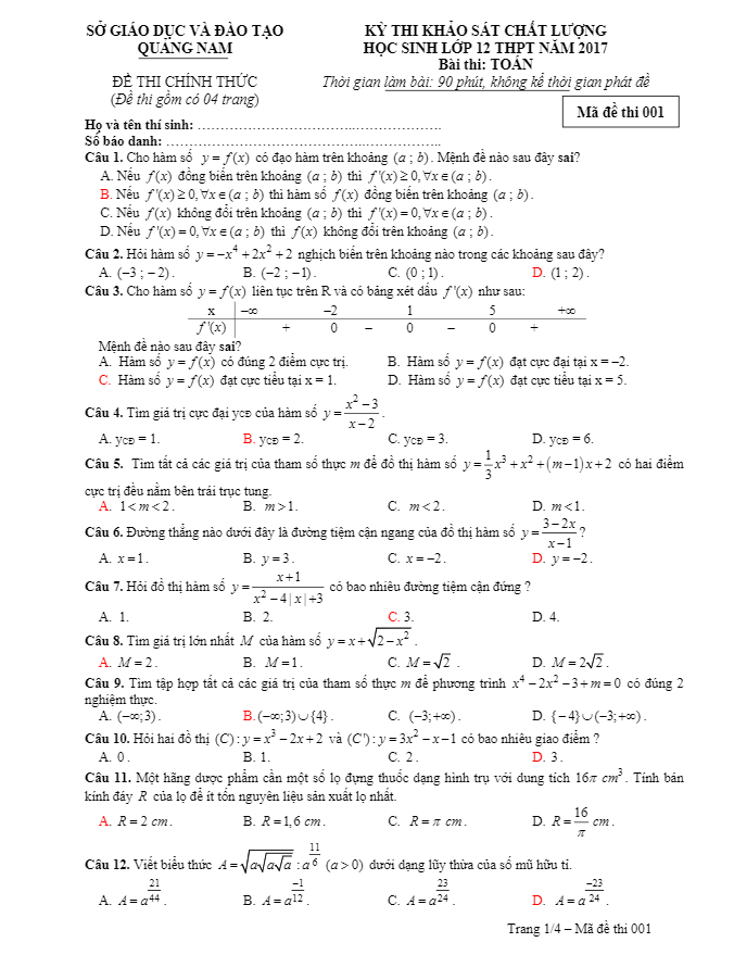 Đề thi thử THPT Quốc gia 2017 môn Toán sở GD và ĐT Quảng Nam