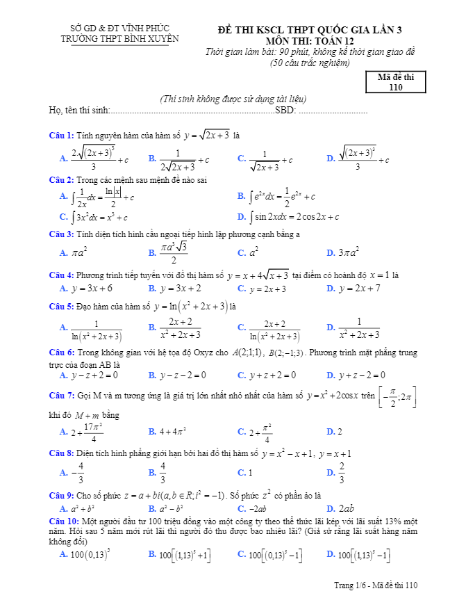 Đề thi thử THPT Quốc gia 2017 môn Toán trường THPT Bình Xuyên – Vĩnh Phúc lần 3