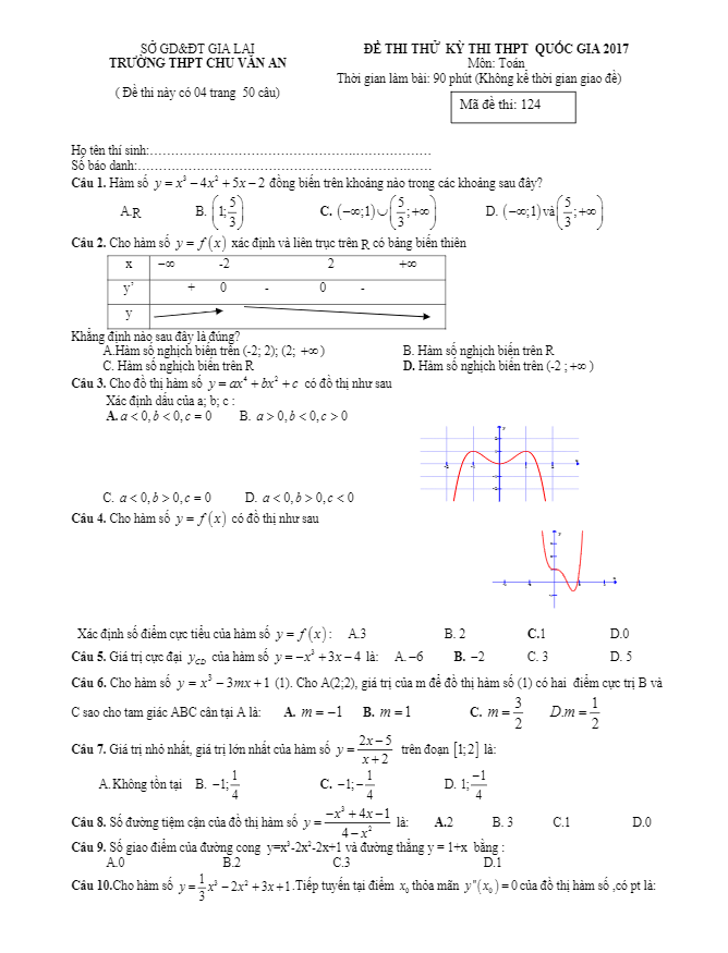 Đề thi thử THPT Quốc gia 2017 môn Toán trường THPT Chu Văn An – Gia Lai