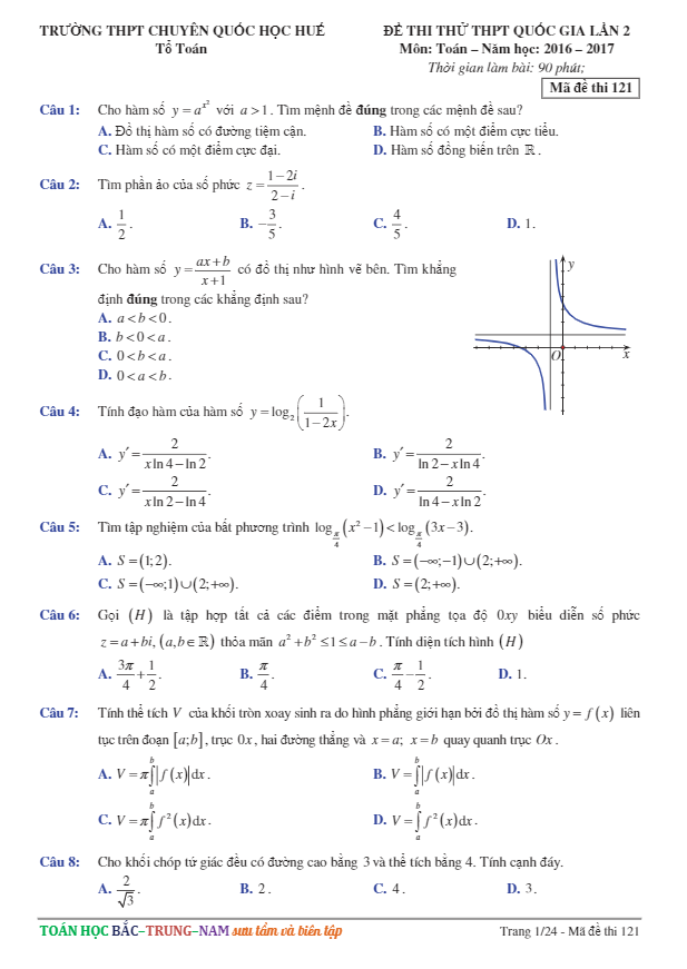 Đề thi thử THPT Quốc gia 2017 môn Toán trường THPT chuyên Quốc học Huế lần 2