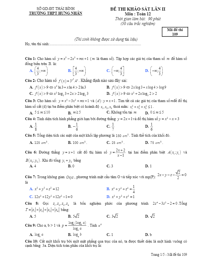 Đề thi thử THPT Quốc gia 2017 môn Toán trường THPT Hưng Nhân – Thái Bình lần 2