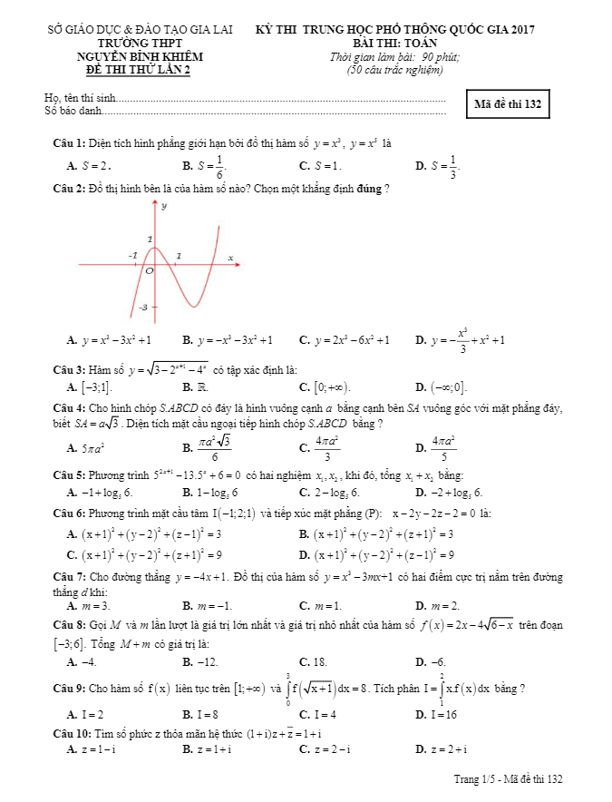 Đề thi thử THPT Quốc gia 2017 môn Toán trường THPT Nguyễn Bỉnh Khiêm – Gia Lai lần 2