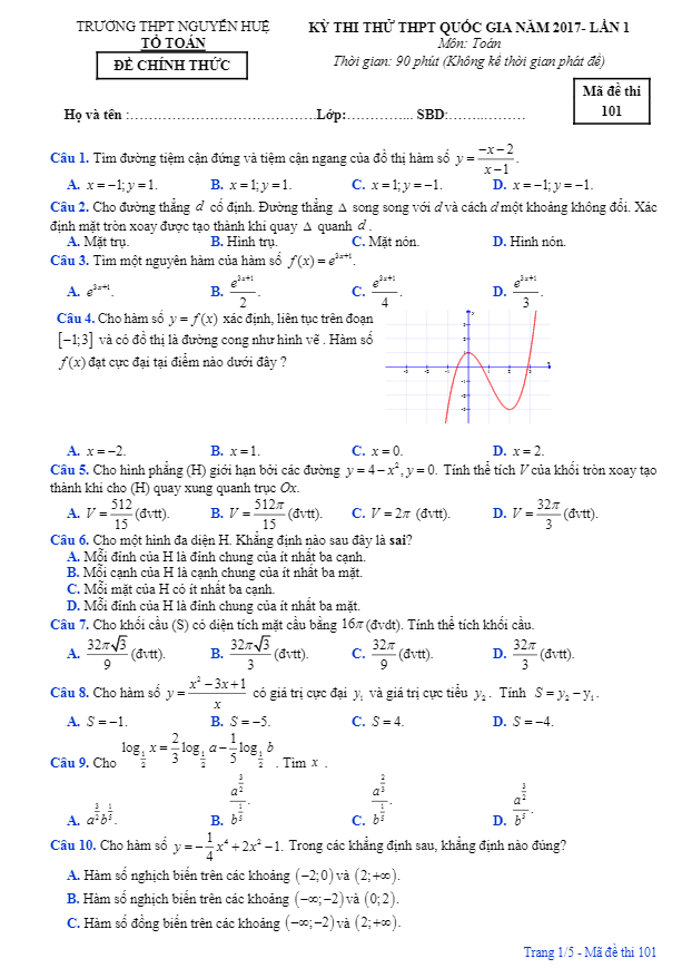 Đề thi thử THPT Quốc gia 2017 môn Toán trường THPT Nguyễn Huệ – TT. Huế