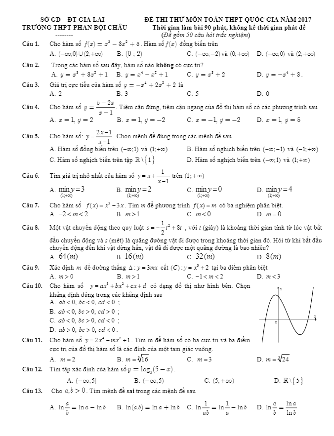 Đề thi thử THPT Quốc gia 2017 môn Toán trường THPT Phan Bội Châu – Gia Lai