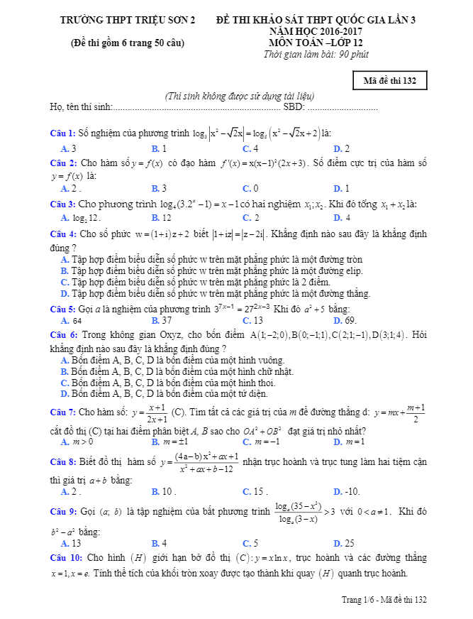 Đề thi thử THPT Quốc gia 2017 môn Toán trường THPT Triệu Sơn 2 – Thanh Hóa lần 3