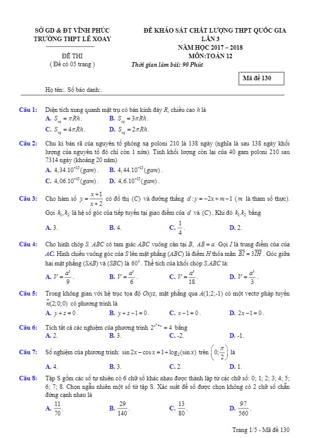Đề KSCL THPT Quốc gia 2018 môn Toán trường THPT Lê Xoay – Vĩnh Phúc lần 3
