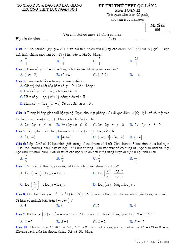 Đề thi thử THPTQG 2018 môn Toán trường THPT Lục Ngạn số 1 – Bắc Giang lần 2