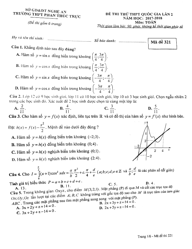 Đề thi thử Toán THPT Quốc gia 2018 trường Phan Thúc Trực – Nghệ An lần 2