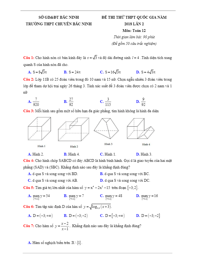 Đề thi thử môn Toán 2018 THPT Quốc gia trường THPT chuyên Bắc Ninh lần 2