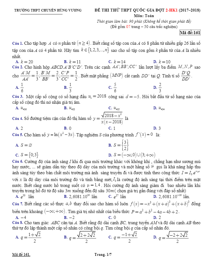 Đề thi thử môn Toán 2018 THPT Quốc gia đợt 2 – HK1 trường chuyên Hùng Vương – Bình Dương