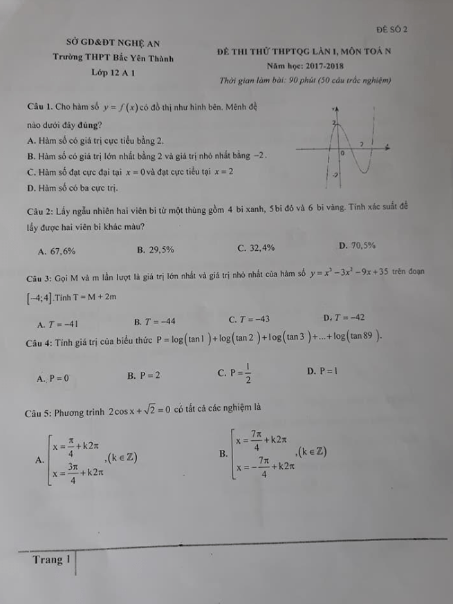 Đề thi thử môn Toán 2018 THPT Quốc gia lần 1 trường THPT Bắc Yên Thành – Nghệ An