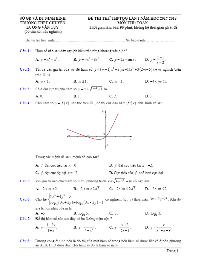 Đề thi thử môn Toán 2018 THPT Quốc gia lần 1 trường THPT chuyên Lương Văn Tụy – Ninh Bình