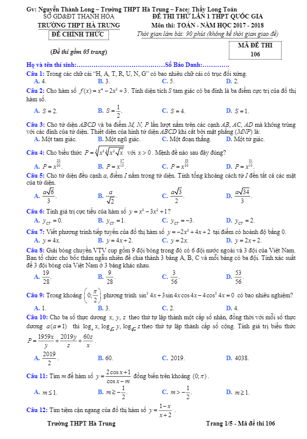 Đề thi thử môn Toán 2018 THPT Quốc gia lần 1 trường THPT Hà Trung – Thanh Hóa