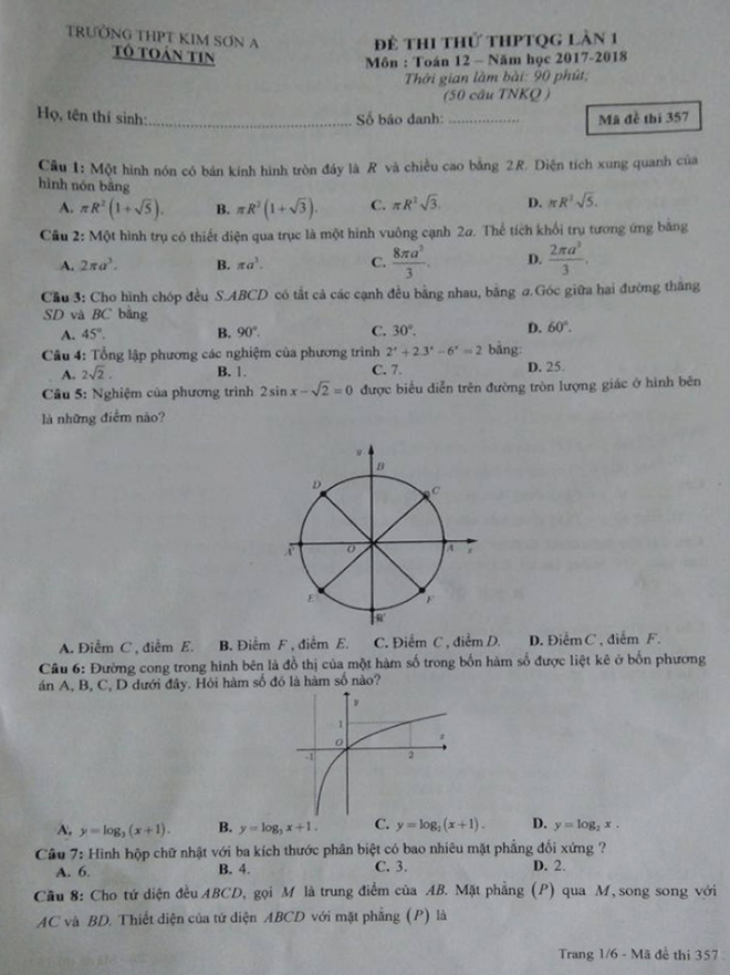 Đề thi thử môn Toán 2018 THPT Quốc gia lần 1 trường THPT Kim Sơn A – Ninh Bình
