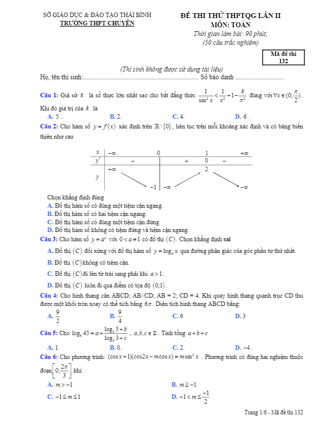 Đề thi thử môn Toán 2018 THPT Quốc gia lần 2 trường THPT chuyên Thái Bình