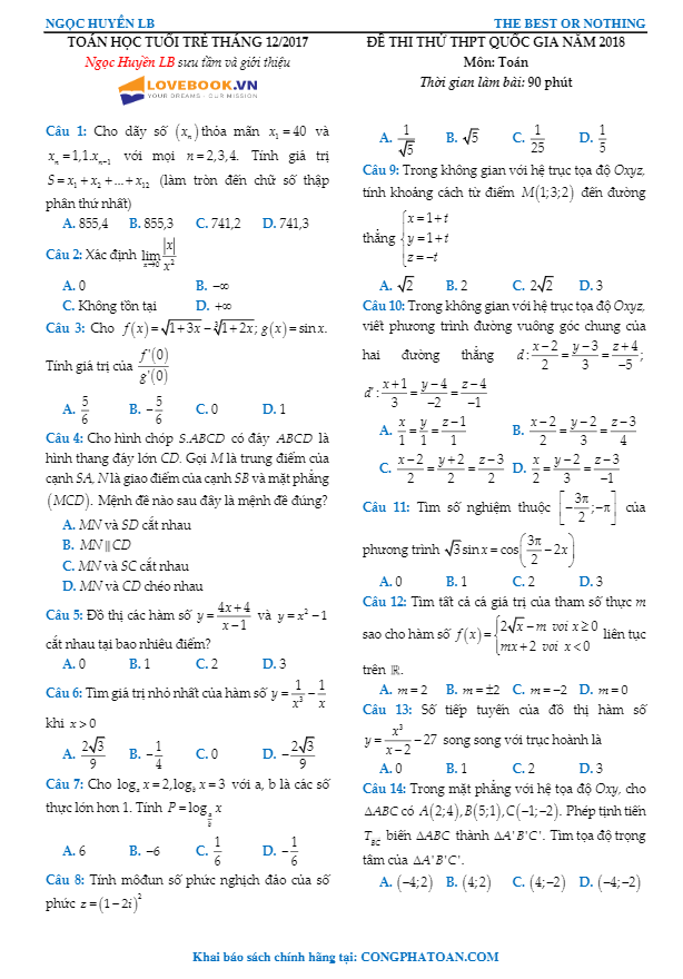 Đề thi thử môn Toán 2018 THPT Quốc gia – tạp chí Toán Học Tuổi Trẻ lần 3