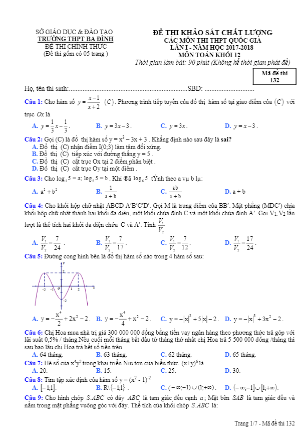 Đề thi thử môn Toán 2018 THPT Quốc gia trường THPT Ba Đình – Thanh Hóa