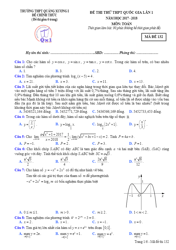 Đề thi thử môn Toán 2018 THPT Quốc gia trường THPT Quảng Xương 1 – Thanh Hóa lần 1