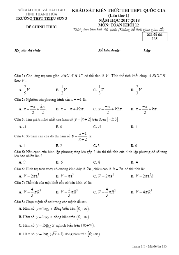 Đề khảo sát chất lượng Toán 12 năm học 2017 – 2018 trường THPT Triệu Sơn 1 – Thanh Hóa
