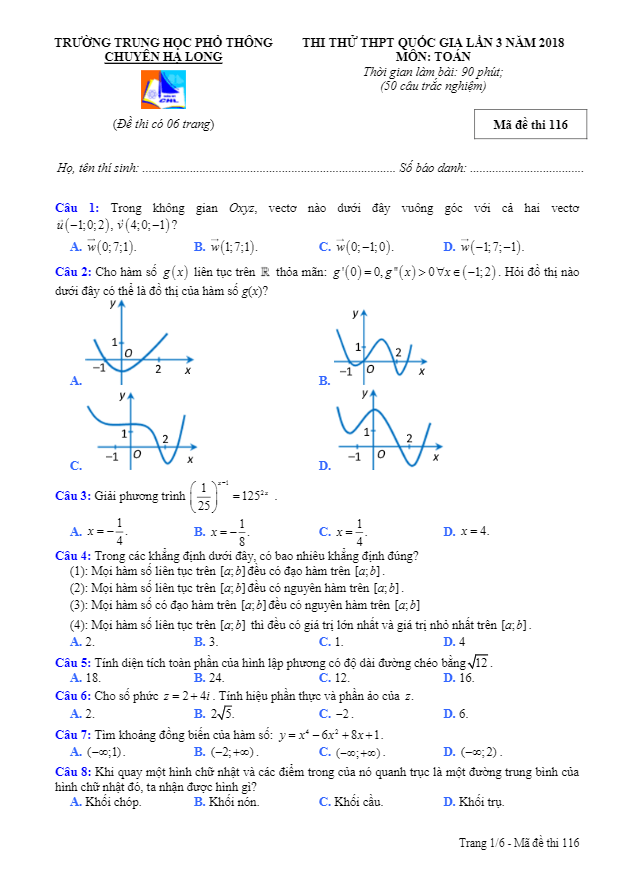 Đề thi thử Toán THPTQG 2018 trường chuyên Hạ Long – Quảng Ninh lần 3