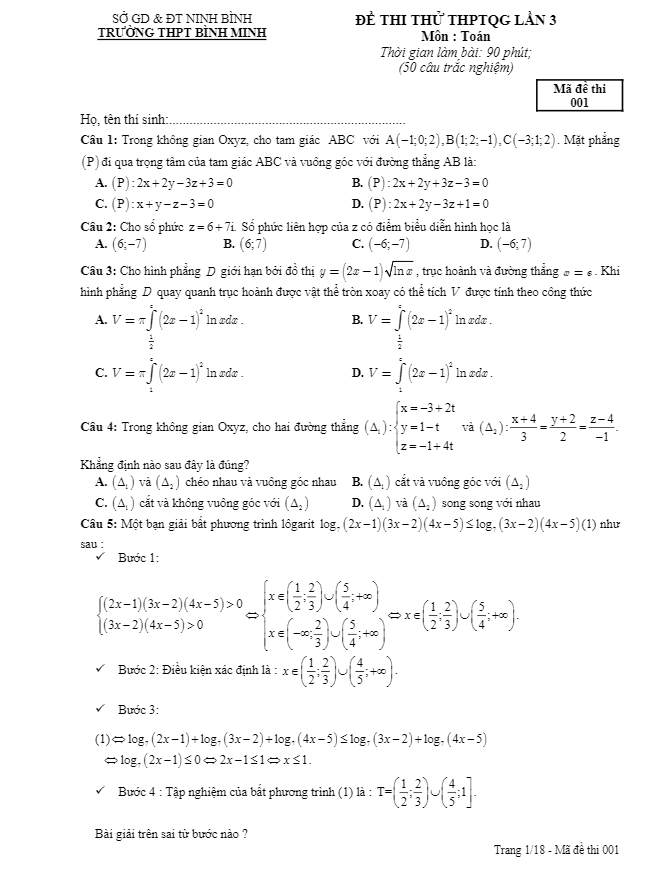 Đề thi thử Toán THPTQG 2018 trường THPT Bình Minh – Ninh Bình lần 3