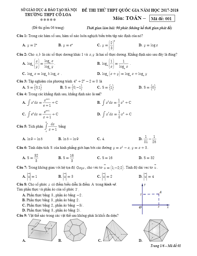 Đề thi thử Toán THPTQG 2018 trường THPT Cổ Loa – Hà Nội lần 2