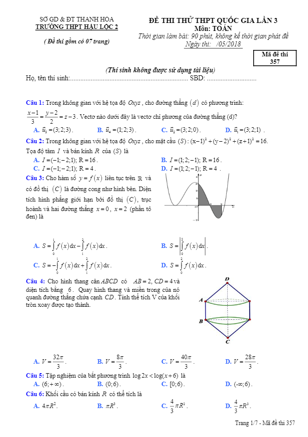 Đề thi thử Toán THPTQG 2018 trường THPT Hậu Lộc 2 – Thanh Hóa lần 3