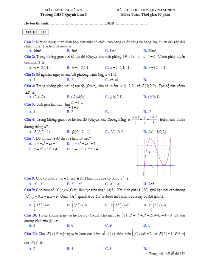 Đề thi thử Toán THPTQG 2018 trường THPT Quỳnh Lưu 3 – Nghệ An