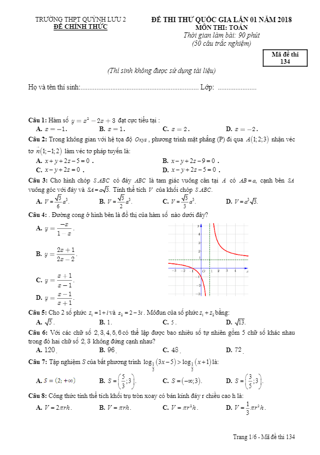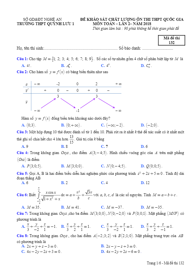 Đề thi thử Toán THPTQG 2018 trường THPT Quỳnh Lưu 2 – Nghệ An lần 1