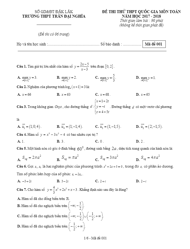Đề thi thử môn Toán THPTQG 2018 trường Trần Đại Nghĩa – Đăk Lăk