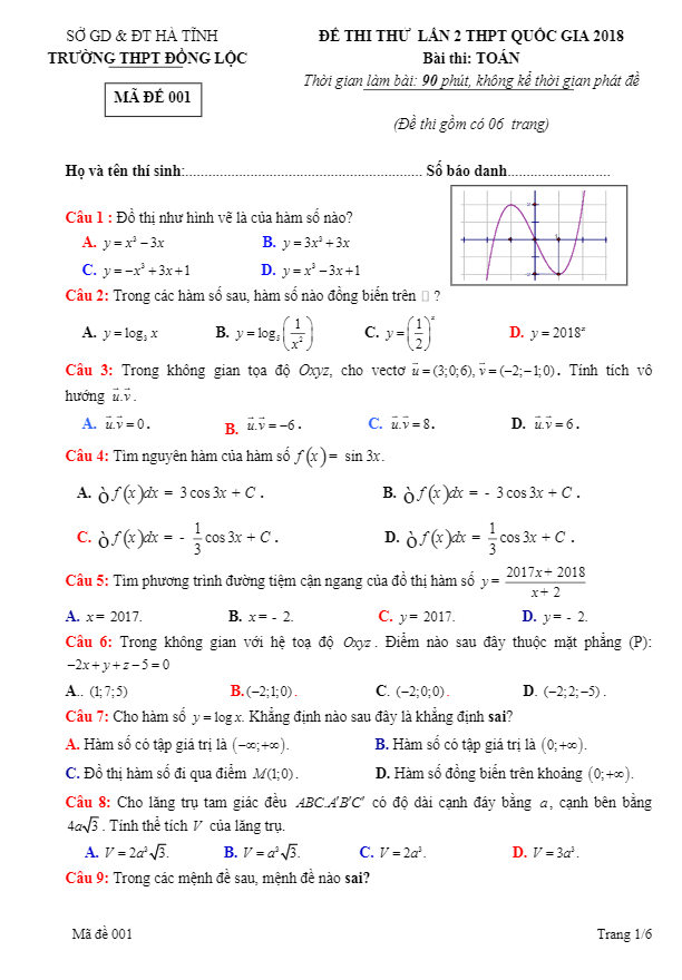 Đề thi thử THPT Quốc gia 2018 môn Toán trường THPT Đồng Lộc – Hà Tĩnh lần 2