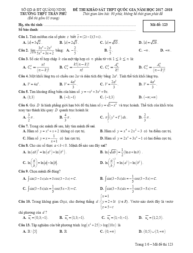Đề thi thử THPT Quốc gia 2018 môn Toán trường THPT Trần Phú – Quảng Ninh