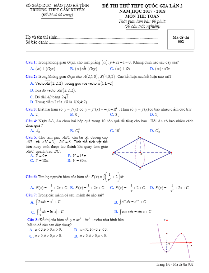 Đề thi thử THPTQG 2018 môn Toán trường THPT Cẩm Xuyên – Hà Tĩnh lần 2