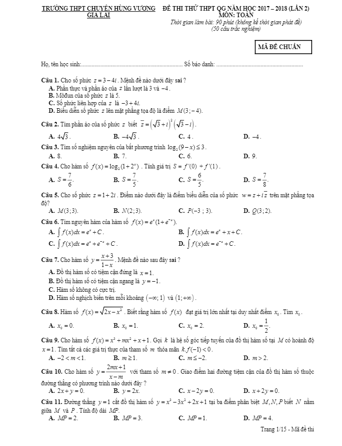 Đề thi thử THPTQG 2018 môn Toán trường THPT chuyên Hùng Vương – Gia Lai lần 2