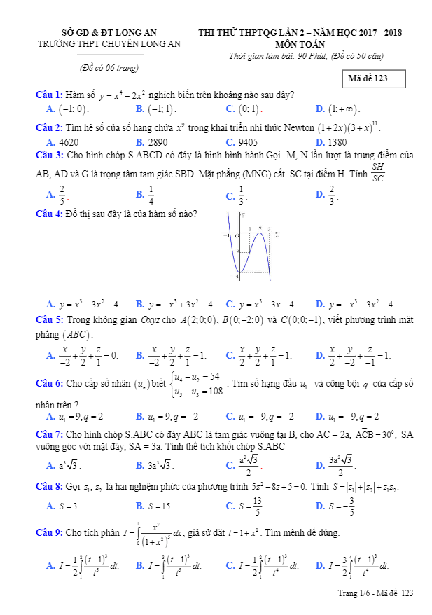 Đề thi thử THPTQG 2018 môn Toán trường THPT chuyên Long An lần 2