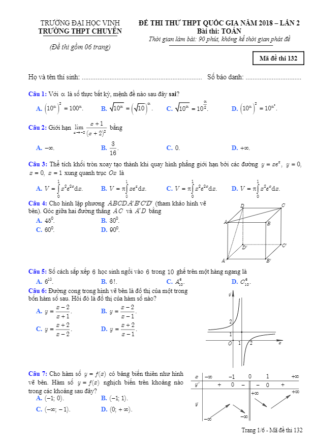 Đề thi thử Toán THPTQG 2018 trường THPT chuyên Đại học Vinh – Nghệ An lần 2