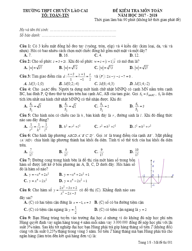 Đề thi thử Toán THPTQG 2018 trường THPT chuyên Lào Cai