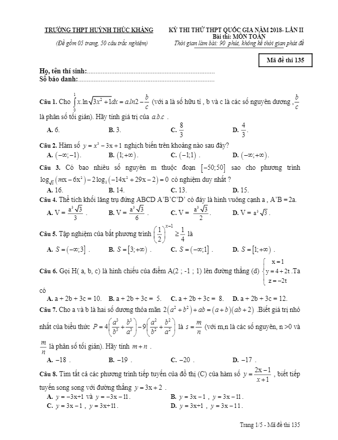 Đề thi thử Toán THPTQG 2018 trường THPT Huỳnh Thúc Kháng – Khánh Hòa lần 2