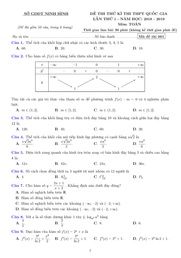Đề thi thử Toán THPT Quốc gia 2019 lần 1 sở GD&ĐT Ninh Bình