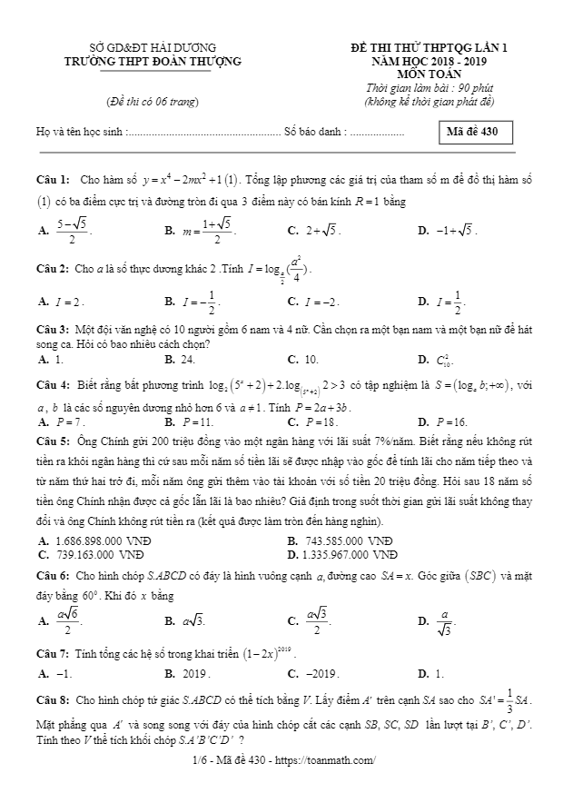 Đề thi thử Toán THPTQG 2019 lần 1 trường THPT Đoàn Thượng – Hải Dương
