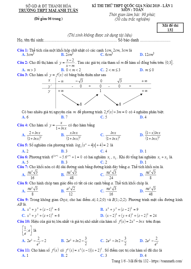 Đề thi thử Toán THPTQG 2019 lần 1 trường THPT Mai Anh Tuấn – Thanh Hóa