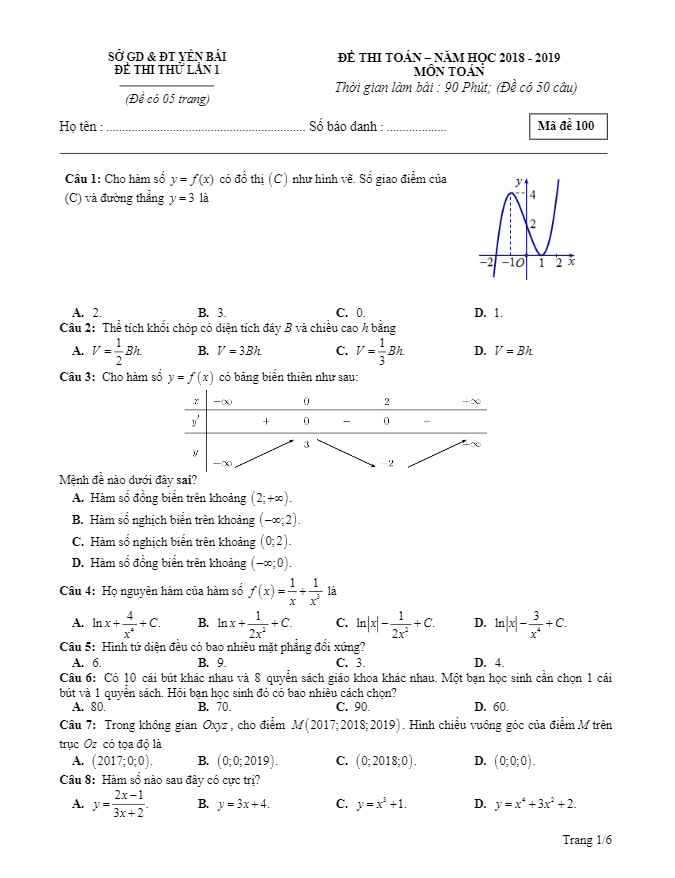 Đề thi thử THPT Quốc gia 2019 môn Toán sở GD&ĐT Yên Bái